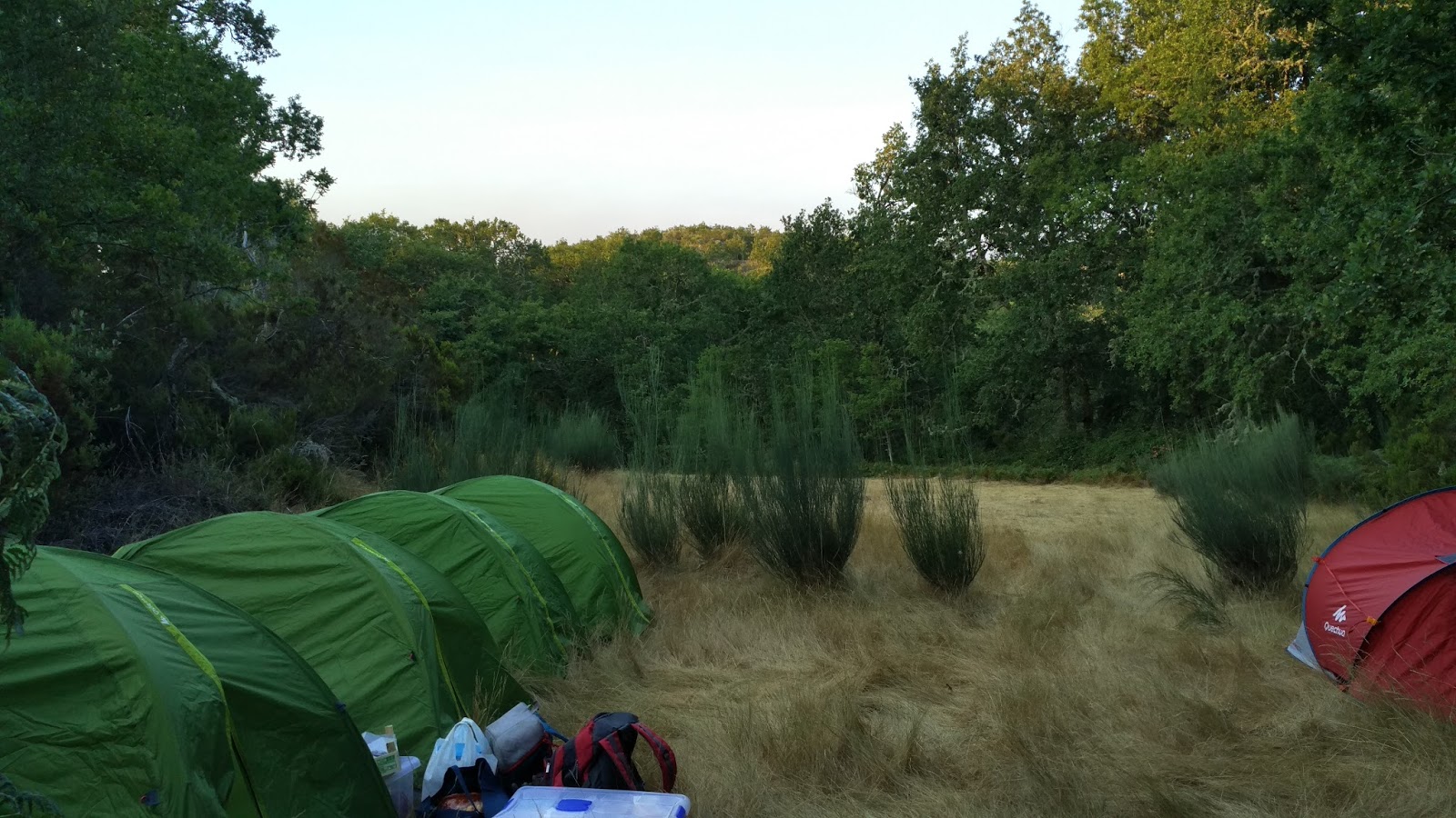| Acampamento pela manhã, com o sol a surgir na copa dos carvalhos. |