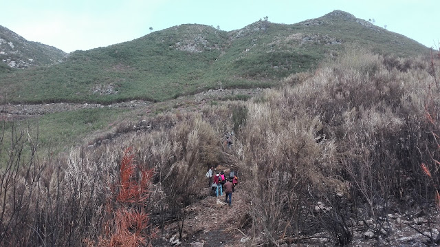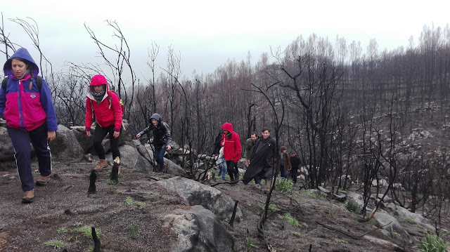 Durante a caminhada foi possível ver, avaliar e discutir duas situações distintas: a 1ª área de fogo controlado (já com um ano de desenvolvimento e acções de gestão) e a área alvo do mais recente fogo controlado, de Fevereiro de 2018.