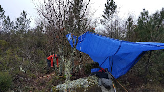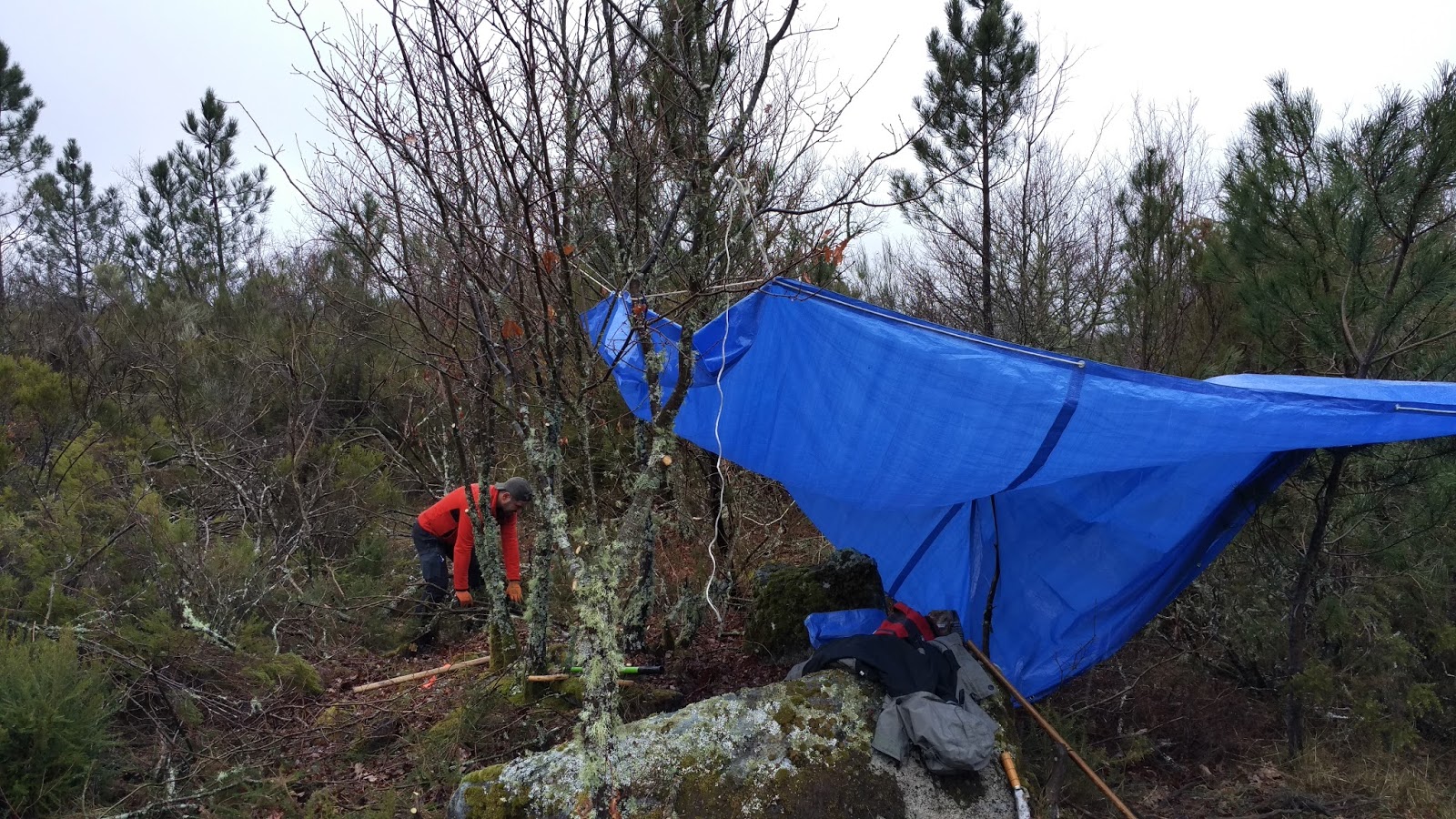 As previsões não eram as ideais, avançámos e antes de iniciar os trabalhos, já tínhamos o abrigo montado de modo a que nada colocasse em perigo a nossa merenda.