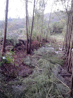 Perto de uma linha de água, iniciámos a abertura de um caminho antigo que permitirá aceder a uma considerável área plana situada no interior da propriedade e simultaneamente reabilitar caminhos que pela sua falta de uso, hoje encontram-se escondidos no interior da vegetação.