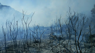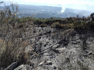 Note-se este giestal, depois do fogo de ontem, que está muito longe de ter sido completamente incinerado como poderia acontecer em situações extremas, pelo contrário, são visiveis ramos bastante finos, demonstrando que a intensidade de fogo foi muito moderada.
