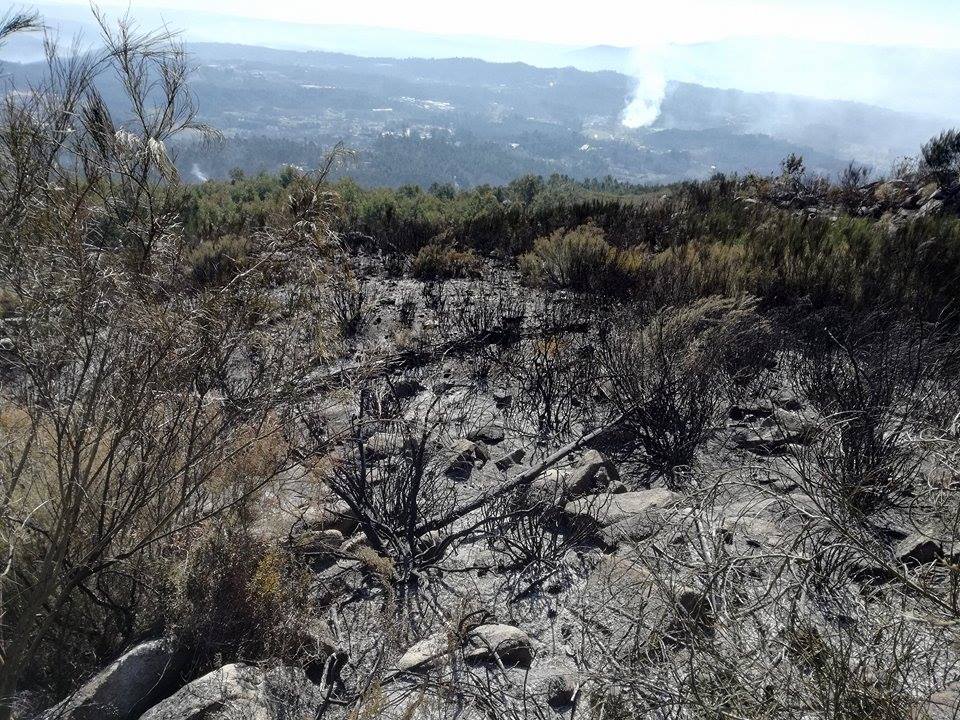 Note-se este giestal, depois do fogo de ontem, que está muito longe de ter sido completamente incinerado como poderia acontecer em situações extremas, pelo contrário, são visiveis ramos bastante finos, demonstrando que a intensidade de fogo foi muito moderada.
